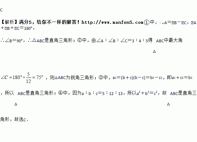 △ABC的三边长分别为a,b,c,下列条件:①∠A=∠B-∠C;②∠A:∠B:∠C=3:4:5;③a2=(b+c)(b-c);④a:b:c=5:12:13,其中能判断△ABC是直角三角形的个数有( )