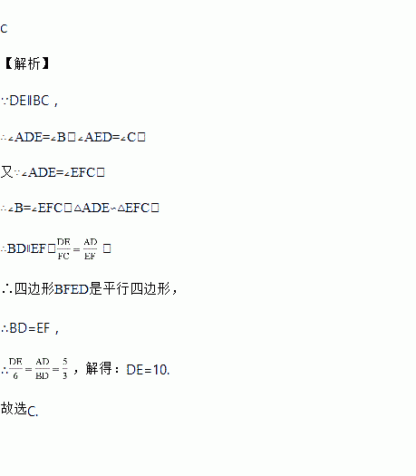如图,在△ABC中,DE∥BC,∠ADE=∠EFC,AD∶BD=5∶3,CF=6,则DE的长为( )