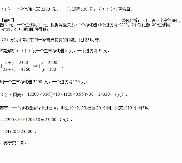 “国美”、“苏宁”两家电器商场出售同样的空气净化器和过滤网,空气净化器和过滤网在两家商场的售价一样.已知买一个空气净化器和