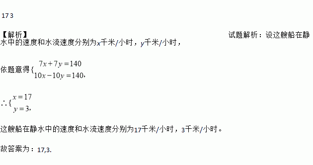 已知A、B两个码头相距140千米,一艘轮船在其间航行,顺流用了7小时,逆流用了10小时,那么这艘船在静水中的速度和水流速度分别为________千米/时、________千米/时.