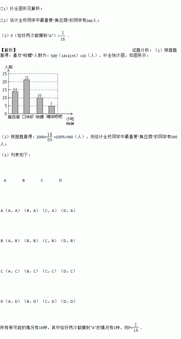 (1)补全图形见解析; (2)估计全校同学中最喜爱“臭豆腐”的同学有560人; (3)P(恰好两次都摸到“A”)=. 【解析】试题分析:(1)根据题意得:喜欢“唆螺”人数为:50﹣(14+21+5)=10(人),补全统计图,如图所示: (2)根据题意得:2000××100%=560(人),则估计全校同学中最喜爱“臭豆腐”的同学有560人; (3)列表如下: ...
