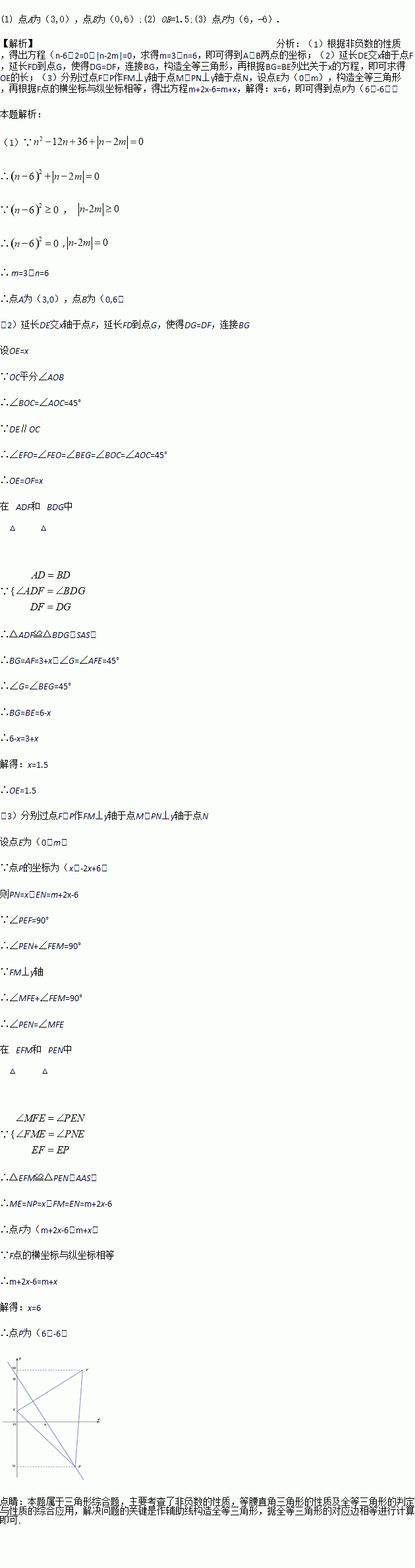 如图1,直线AB分别与x轴、y轴交于A、B两点,OC平分∠AOB交AB于点C,点D为线段AB上一点,过点D作DE//OC交y轴于点E,已知AO=m,BO=n,且m、n满足n2-12+36+|n-2m|=0.