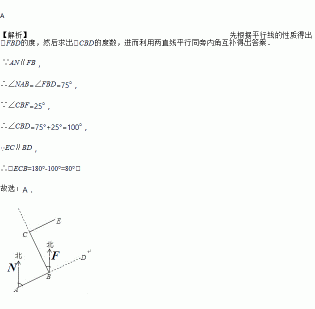 如图,要修建一条公路,从A村沿北偏东75°方向到B村,从B村沿北偏西25°方向到C村.若要保持公路CE与AB的方向一致,则∠ECB的度数为( )