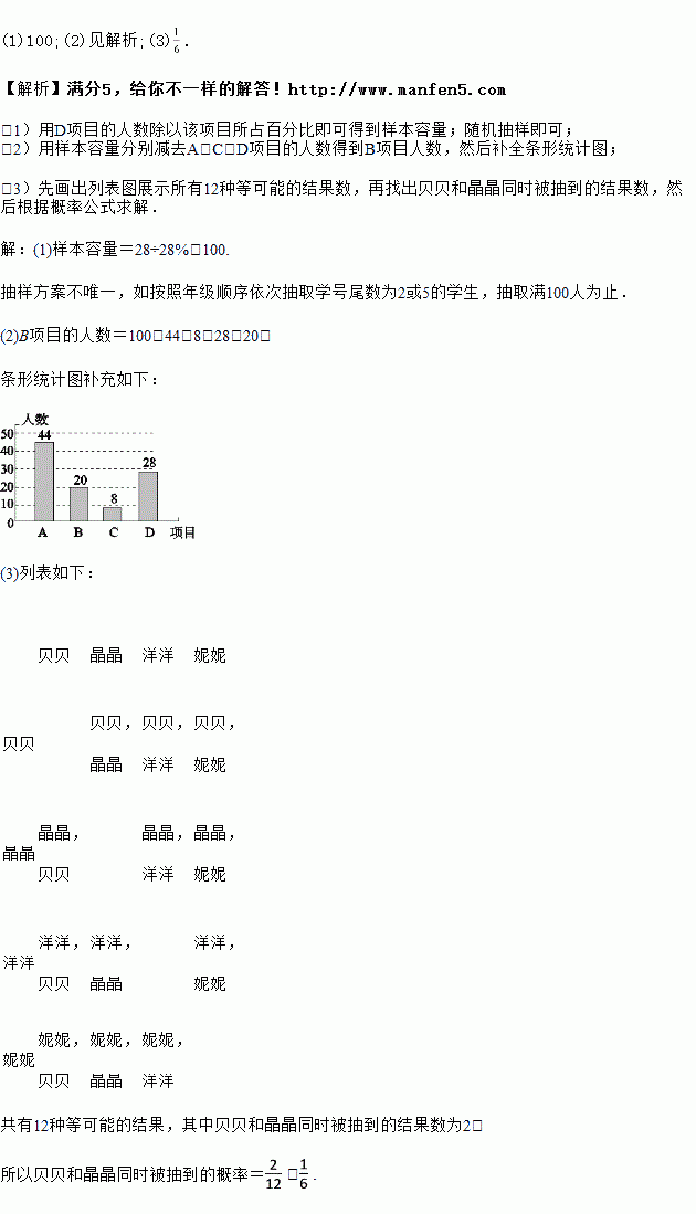 (3)该校贝贝、晶晶、洋洋和妮妮是学校的校园之星,现要从这四人中选出两人作为“阳光体育”运动形象代言人,贝贝和晶晶同时被抽到的概率是多少?