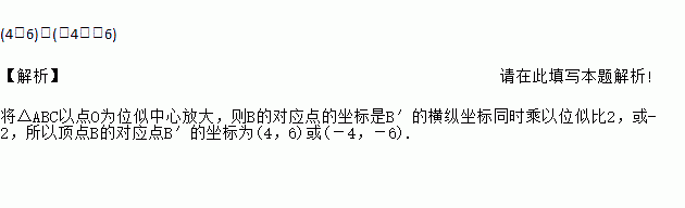 如图,已知A(3,0),B(2,3),将△OAB以点O为位似中心,相似比为2∶1,放大得到△OA′B′,则顶点B的对应点B′的坐标为_____________.