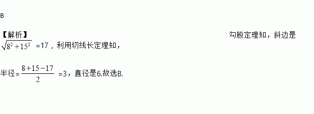 《九章算术》是我国古代内容极为丰富的数学名著,书中有这样一个问题:“今有勾八步,股十五步,问勾中容圆,径几何?”其意思是:“如图,今有直角三角形,勾(短直角边)长为8步,股(长直角边)长为15步,问该直角三角形能容纳的圆形(内切圆)直径是多少?”此问题中,该内切圆的直径是( )