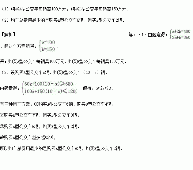 若购买A型公交车1辆,B型公交车2辆,共需400万元;若购买A型公交车2辆,B型公交车1辆,共需350万元.