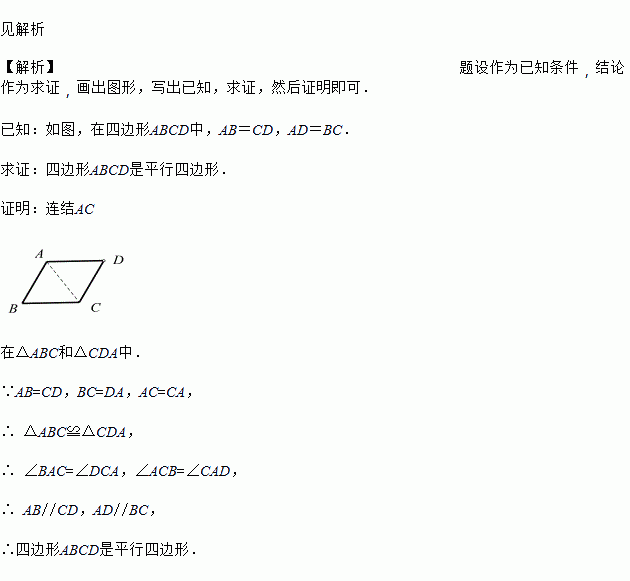 求证:两组对边分别相等的四边形是平行四边形.(要求:画出图形,写出已知,求证和证明过程)
