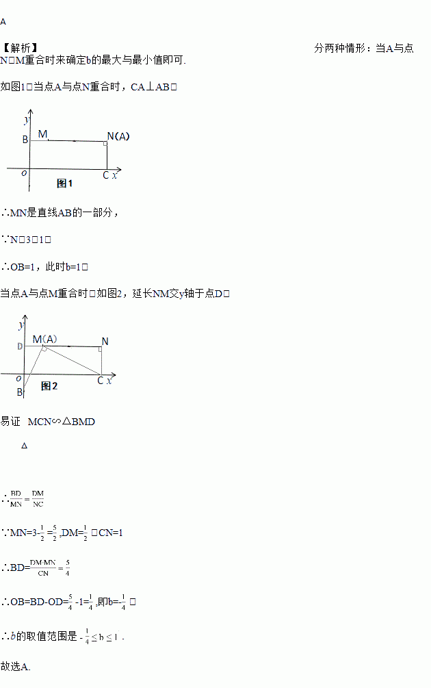 ,1),(3,1),(3,0),点A为线段MN上的一个动点,连接AC,过点A作交y轴于点B,当点A从M运动到N时,点B随之运动,设点B的坐标为(0,b),则b的取值范围是( )![]()