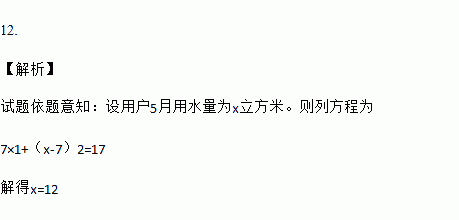 我市某县城为鼓励居民节约用水,对自来水用户按分段计费方式收取水费:若每月用水不超过7m3,则按每立方米1元收费;若每月用水超过7m3,则超过部分按每立方米2元收费. 如果某居民户今年5月缴纳了17元水费,那么这户居民今年5月的用水量为_______m3 .