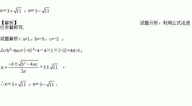 x1=,x2= 【解析】试题分析:利用公式法进行求解即可. 试题解析:a=1,b=-6,c=-2 , △=b2-4ac=(-6)2-4-4×1×(-2)=44>0, = , ∴x1=,x2=.