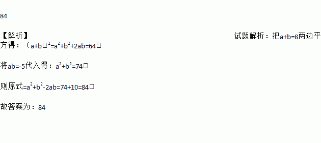 84 【解析】试题解析:把a+b=8两边平方得:(a+b)2=a2+b2+2ab=64, 将ab=-5代入得:a2+b2=74, 则原式=a2+b2-2ab=74+10=84, 故答案为:84