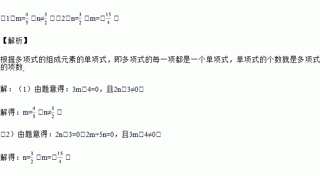 (2)当m、n满足什么条件时,该多项式是关于x的三次二项式.