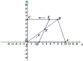 Èçͼ£¬ÔÚÆ½ÃæÖ±½Ç×ø±êϵÖУ¬µãA£¨10£¬0£©£¬µãC£¨0£¬6£©£¬BC¡ÎOA£¬OB=10£¬µãE´ÓµãB³ö·¢£¬ÒÔÿÃë1¸öµ¥Î»³¤¶ÈÑØBCÏòµãCÔ˶¯£¬µãF´ÓµãO³ö·¢£¬ÒÔÿÃë2¸öµ¥Î»³¤¶ÈÑØOBÏòµãBÔ˶¯£¬ÏÖµãE¡¢Fͬʱ³ö·¢£¬Á¬½ÓEF²¢ÑÓ³¤½»OAÓÚµãD£¬µ±Fµãµ½´ïBµãʱ£¬E¡¢FÁ½µãͬʱֹͣÔ˶¯£®ÉèÔ˶¯Ê±¼äΪtÃë