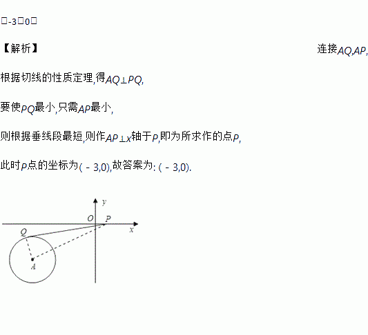 如图所示,在直角坐标系中,A点坐标为(-3,-2),⊙A的半径为1,P为x轴上一动点,PQ切⊙A于点Q,则当PQ最小时,求P点的坐标为___________.