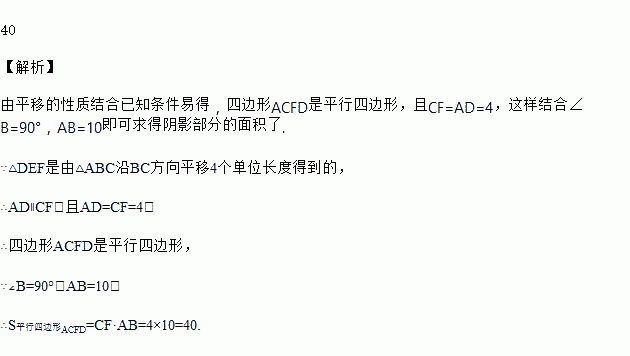 如图,在△ABC 中,∠B=90°,AB=10.将△ABC沿着BC的方向平移至△DEF,若平移的距离是4,则图中阴影部分图形的面积为__________.