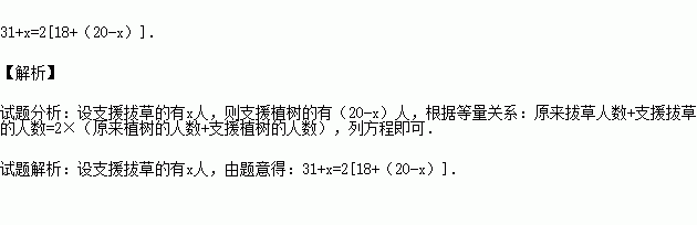 在一次美化校园活动中,先安排31人去拔草,18人去植树,后又增派20人去支援他们,结果拔草的人数是植树的人数的2倍.问支援拔草和植树的分别有多少人?(只列出方程即可)