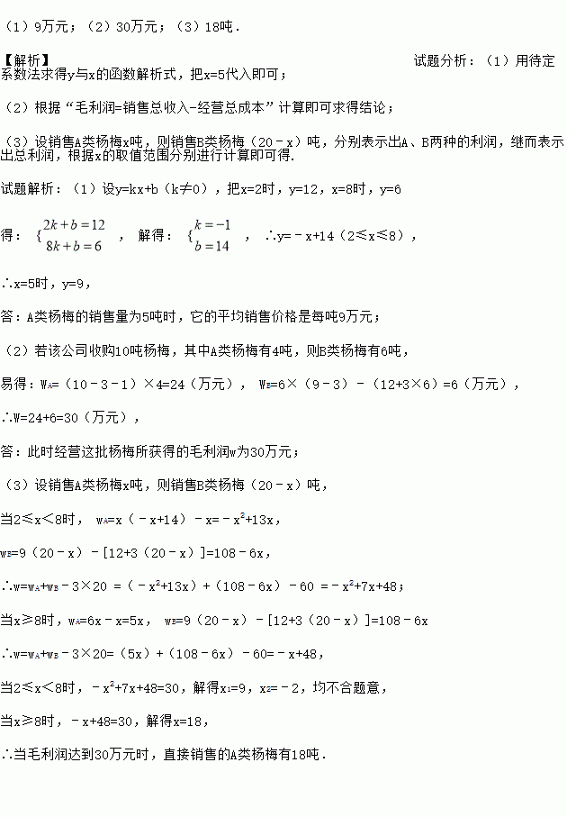 (3)若该公司收购20吨杨梅,要使该公司获得30万元毛利润,求直销的A类杨梅有多少吨?