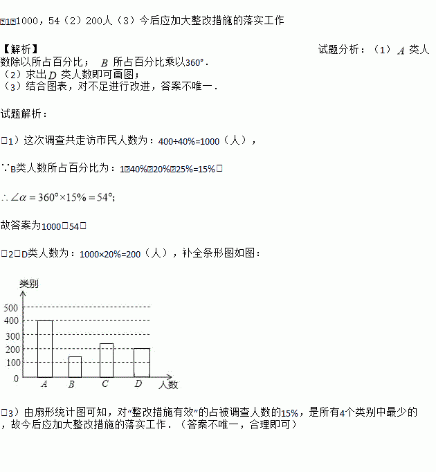(1)1000,54(2)200人(3)今后应加大整改措施的落实工作 【解析】试题分析:(1)类人数除以所占百分比; 所占百分比乘以360°. (2)求出类人数即可画图; (3)结合图表,对不足进行改进,答案不唯一. 试题解析: (1)这次调查共走访市民人数为:400÷40%=1000(人), ∵B类人数所占百分比为:1﹣40%﹣20%﹣25%=15%, 故答案为...