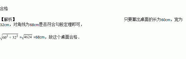 木工做一个长方形桌面,量得桌面的长为60cm,宽为32cm,对角线长为68cm,这个桌面__________ (填“合格”或“不合格”)。