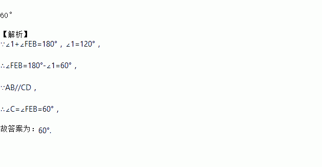 如图,已知AB∥CD,∠1=120°,则∠C=____.