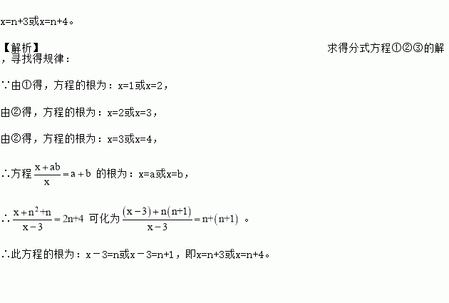 观察分析下列方程:①,②,③;请利用它们所蕴含的规律,求关于x的方程(n为正整数)的根,你的答案是: ▲ .