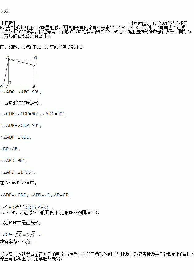 如图,在四边形ABCD中,∠ADC=∠ABC=90°,AD=CD,DP⊥AB于P.若四边形ABCD的面积是18,则DP的长是__.