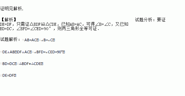 如图,AB=AC,BD=DC,DF⊥AB,DE⊥AC,垂足分别是F,E.求证:DE=DF.