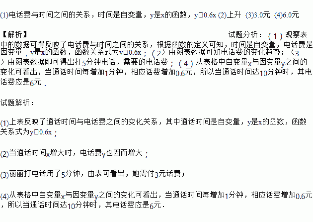 (1)Èç¹ûÓÃx±íʾʱ¼ä£¬y±íʾµç»°·Ñ£¬ÉÏ±í·´Ó³ÁËÄÄÁ½¸ö±äÁ¿Ö®¼äµÄ¹ØÏµ£¿ÄĸöÊÇ×Ô±äÁ¿£¿ÄĸöÊǺ¯Êý£¬ÇëÓÃʽ×Ó±íʾËüÃǵĹØÏµ£»