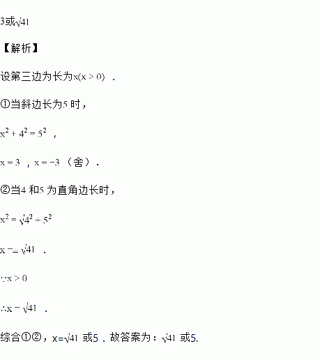 已知一个直角三角形的两边的长分别是4和5,则第三边长为______.
