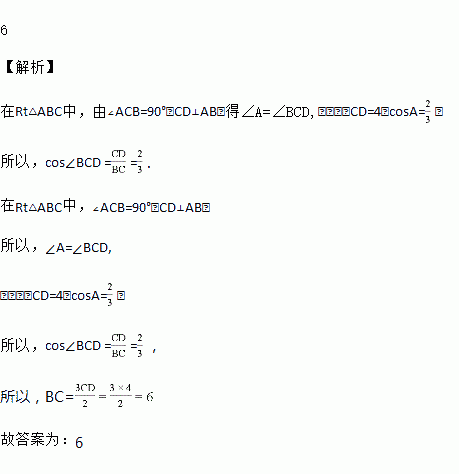 如图,在Rt△ABC中,∠ACB=90°,CD⊥AB,CD=4,cosA=, 那么BC=________
