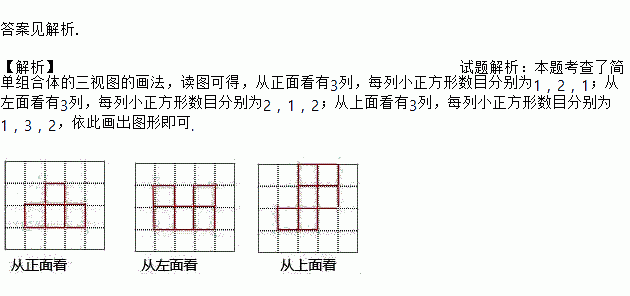 如图是小强用八块相同的小立方体搭成的一个几何体,从正面、左面和上面观察这个几何体,请你在下面相应的位置分别画出你所看到的几何体的形状图(在答题卡上画完图后请用黑色签字笔描图).