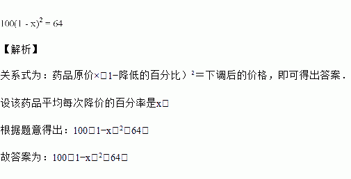 某种药品的价格经过两次连续降价后,由每盒元下调至元.假设每次降价的百分率是,列出方程________.
