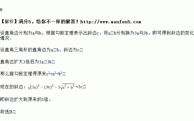 把一个直角三角形的两直角边长同时扩大到原来的3倍,则斜边长扩大到原来的( )