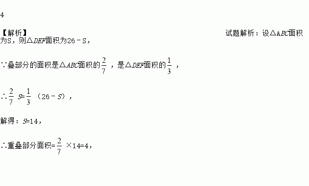 如图,△ABC和△DEF有一部分重叠在一起(图中阴影部分),重叠部分的面积是△ABC面积的,是△DEF面积的,且△ABC与△DEF面积之和为26,则重叠部分面积是____.