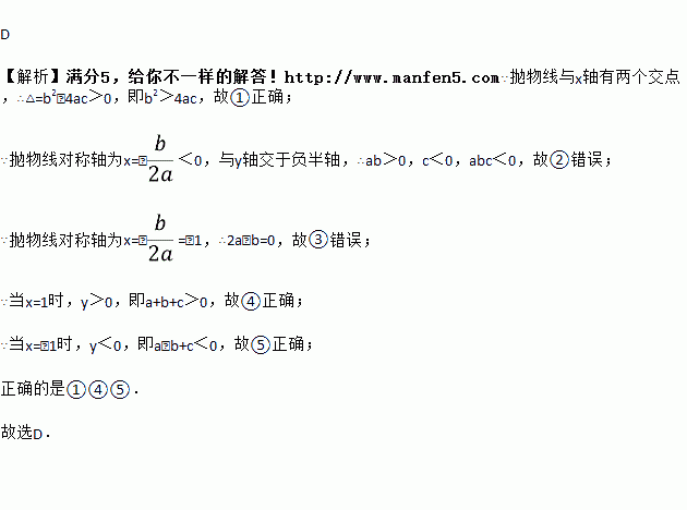 (2011•雅安)已知二次函数y=ax2+bx+c的图象如图,其对称轴x=﹣1,给出下列结果①b2>4ac;②abc>0;③2a+b=0;④a+b+c>0;⑤a﹣b+c<0,则正确的结论是( )