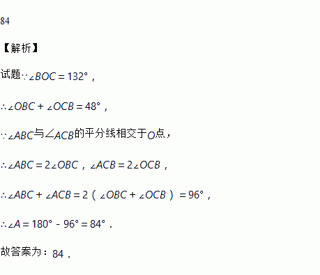 在△ABC中,∠B,∠C的平分线交于点O,若∠BOC=132°,则∠A=________度.