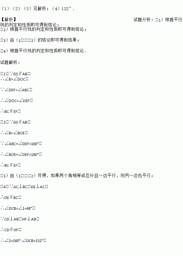 (4)如图③,已知AC⊥BC,CD⊥AB,DE⊥AC,HF⊥AB,若∠1=48°,试求∠2的度数.