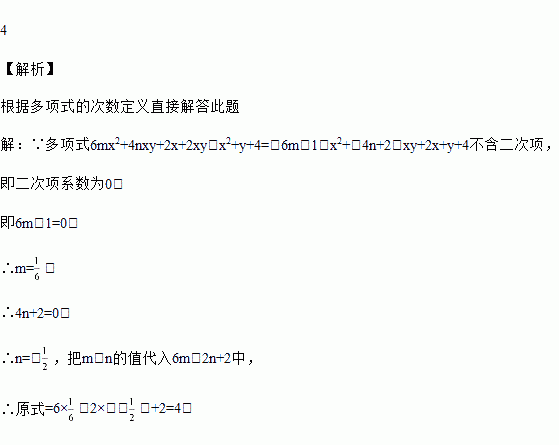 关于x,y的多项式6mx2+4nxy+2x+2xy﹣x2+y+4不含二次项,求6m﹣2n+2的值.