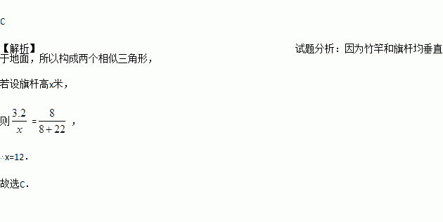 如图,为测量学校旗杆的高度,小东用长为3.2m的竹竿作测量工具,移动竹竿,使竹竿顶端与旗杆顶端的影子恰好落在地面的同一点,此时,竹竿与这一点相距8m,与旗杆相距22m,则旗杆的高为( )m.