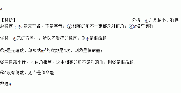 ,则甲比乙发挥得稳定;②单项式πr2的次数是3次;③相等的角是对顶角;④所有实数都有倒数。真命题的个数是( )