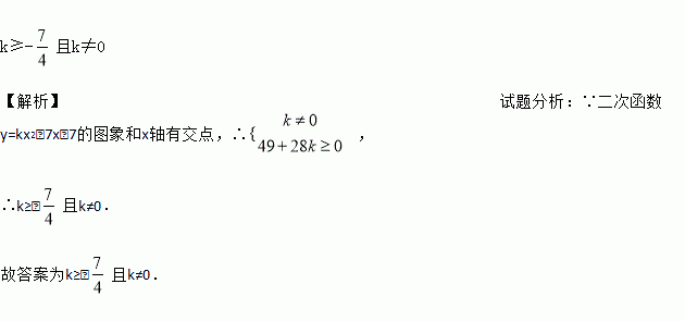 k≥-且k≠0 【解析】试题分析:∵二次函数y=kx2﹣7x﹣7的图象和x轴有交点,∴, ∴k≥﹣且k≠0. 故答案为k≥﹣且k≠0.