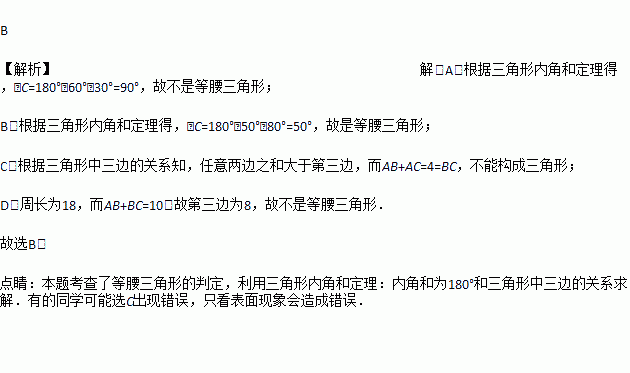 在下列条件中,能断定△ABC为等腰三角形的是( )