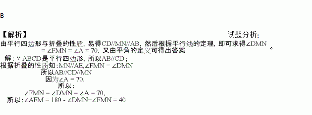 如图,在□ABCD中,∠A=70°,将□ABCD折叠,使点D,C分别落在点F,E处(点F,E都在AB所在的直线上),折痕为MN,则∠AMF等于( )