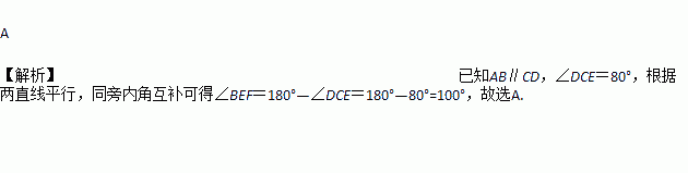 如图,AB∥CD,∠DCE=80°,则∠BEF=( )