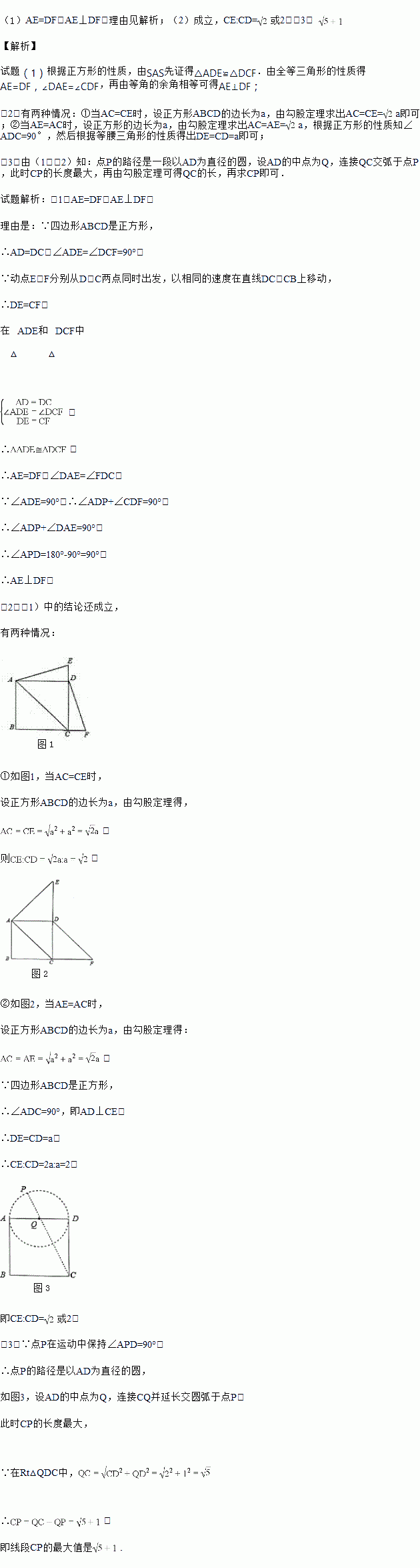 (3)如图3,当E,F分别在直线DC,CB上移动时,连接AE和DF交于点P,由于点E,F的移动,使得点P也随之运动,请你画出点P运动路径的草图.若AD=2,试求出线段CP的最大值.