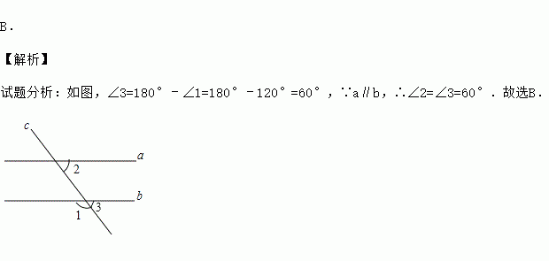 B. 【解析】 试题分析:如图,∠3=180°﹣∠1=180°﹣120°=60°,∵a∥b,∴∠2=∠3=60°.故选B.