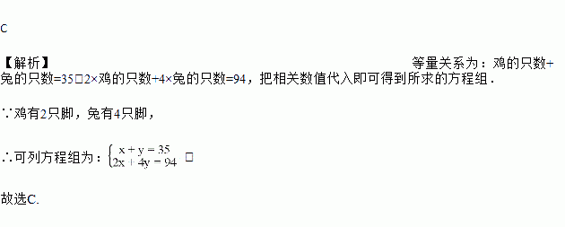 “今有鸡兔同笼,上有三十五头,下有九十四足,问鸡兔各几何?”设鸡为x只,兔为y只,则所列方程组正确的是( )