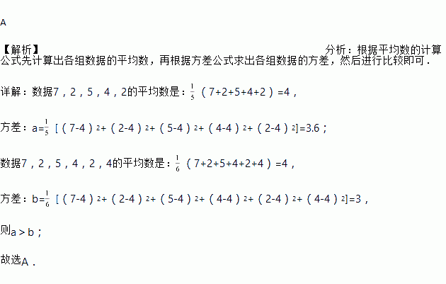 一组数据7,2,5,4,2的方差为a,若再增加一个数据4,这6个数据的方差为b,则a与b的大小关系是( )
