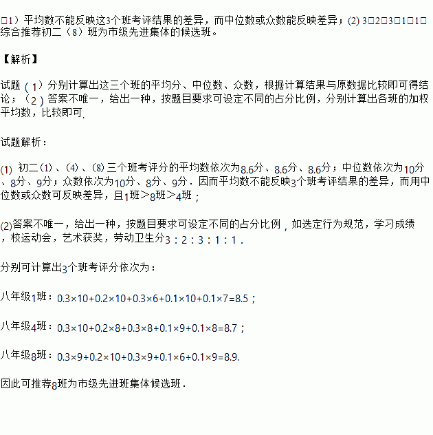 某学校对初二年级经过初步比较后,决定从初二(1)、(4)、(8)这三个班中推荐一个班为市级先进班集体的候选班.现对这三个班进行综合素质考评,下表是他们五项素质考评的得分表(以分为单位,每项满分为10分)。